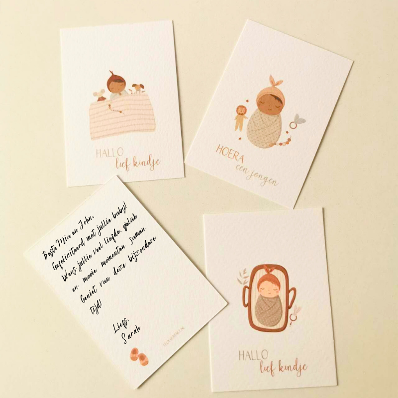 Is dit een kraamcadeau? Het is optioneel om een gepersonaliseerd babykaartje toe te voegen om je vriend of familie te verrassen. Laat een bericht achter bij je bestelling, zodat wij het kaartje met de hand kunnen schrijven voor je dierbaren.