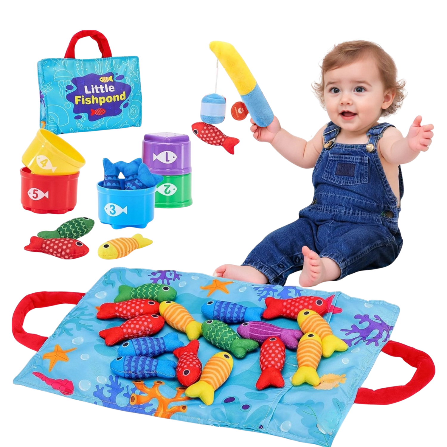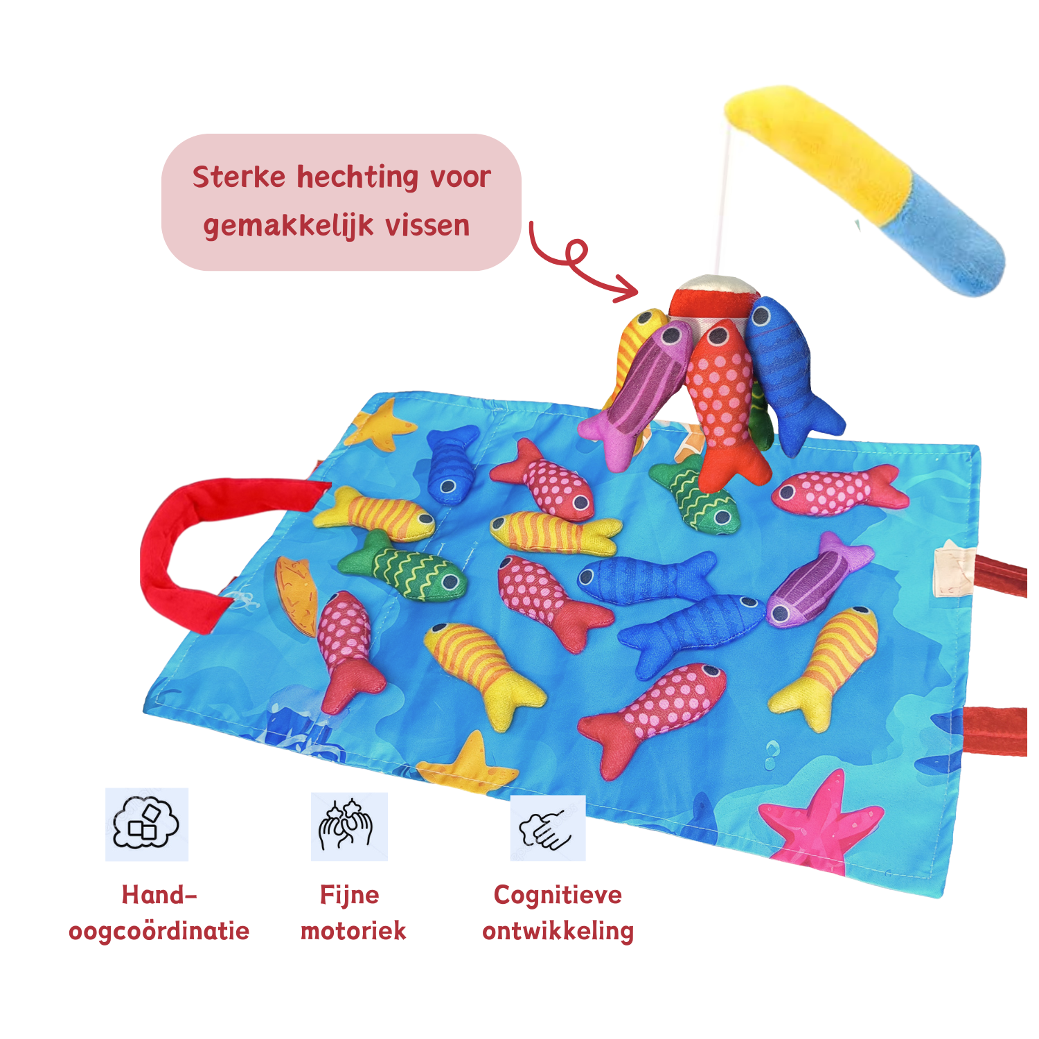 Laat je kleintje spelenderwijs leren met dit zachte visspel voor baby’s! Het spel bevat vijf kleurrijke stoffen kommetjes en bijpassende visjes, waarmee kinderen kleuren en aantallen kunnen ontdekken. De hengel heeft sterke klittenband waardoor het makkelijk is de visjes te “vangen”. Alles is volledig gemaakt van zachte stof, veilig voor baby’s en peuters. Inclusief een handig stoffen opbergzakje om alle visjes netjes op te bergen. Perfect voor hand-oog coördinatie en educatief plezier!